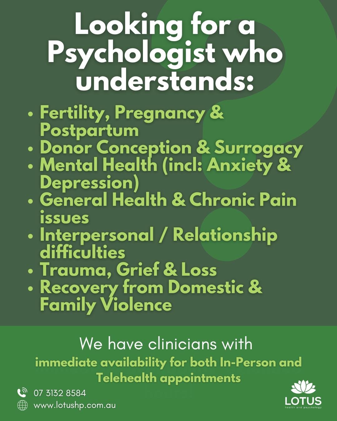 Since that time, Lotus Health and Psychology has expanded to provide “wrap-around” care to perinatal patients, including psychological, counselling, naturopathic and nutrition, lactation, and parenting support. As more practitioners have joined our team, they have brought with them their unique professional experience, both within and outside of the perinatal space. This has seen Lotus Health and Psychology evolve beyond its original perinatal-focus, to provide integrated support for a variety of other presentations.